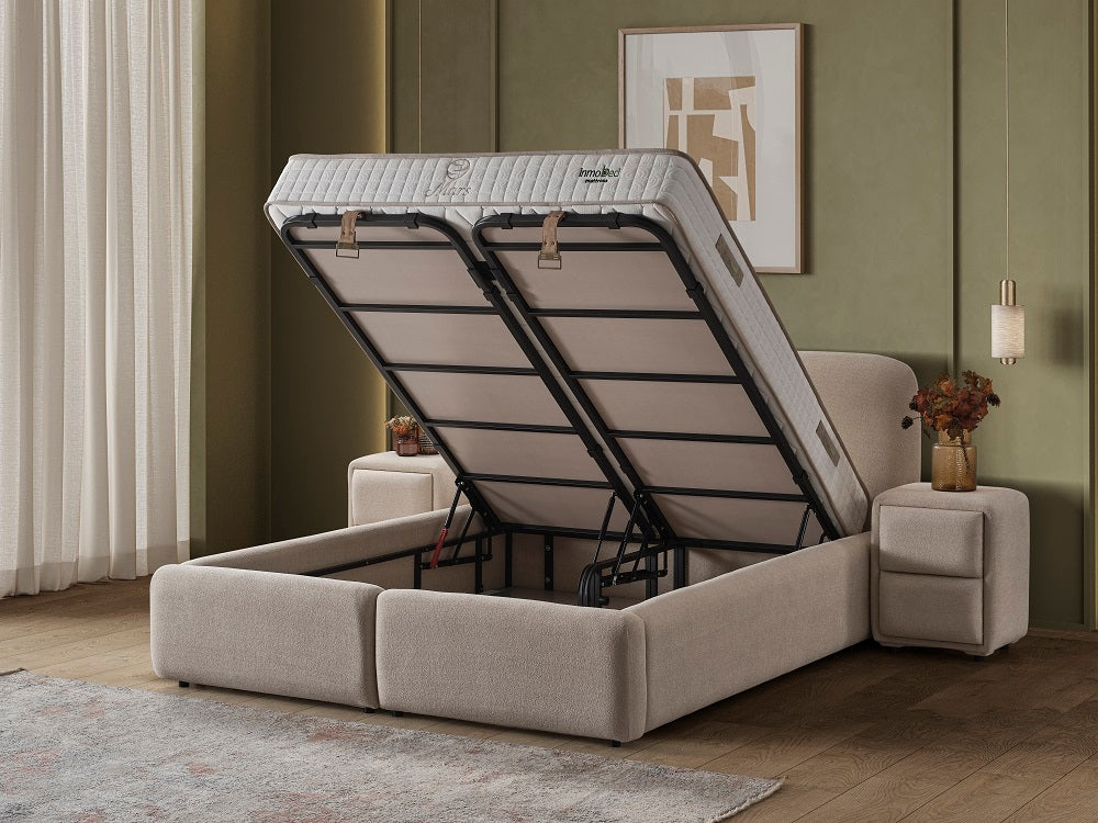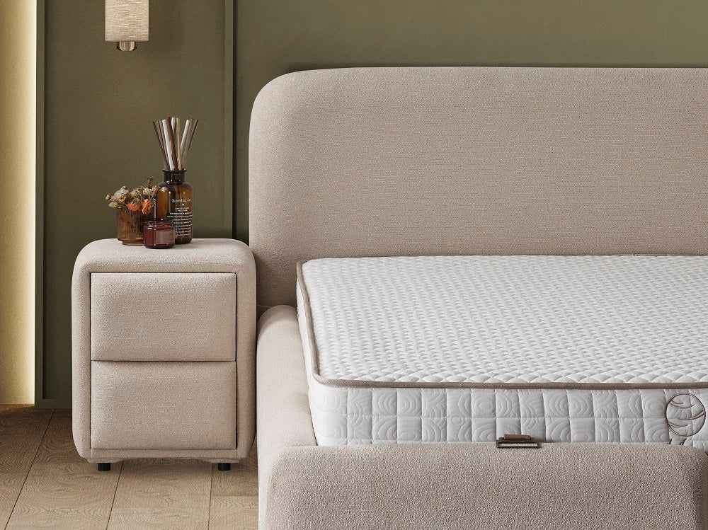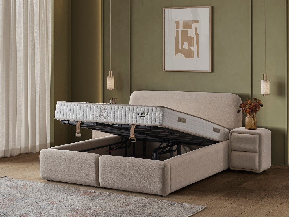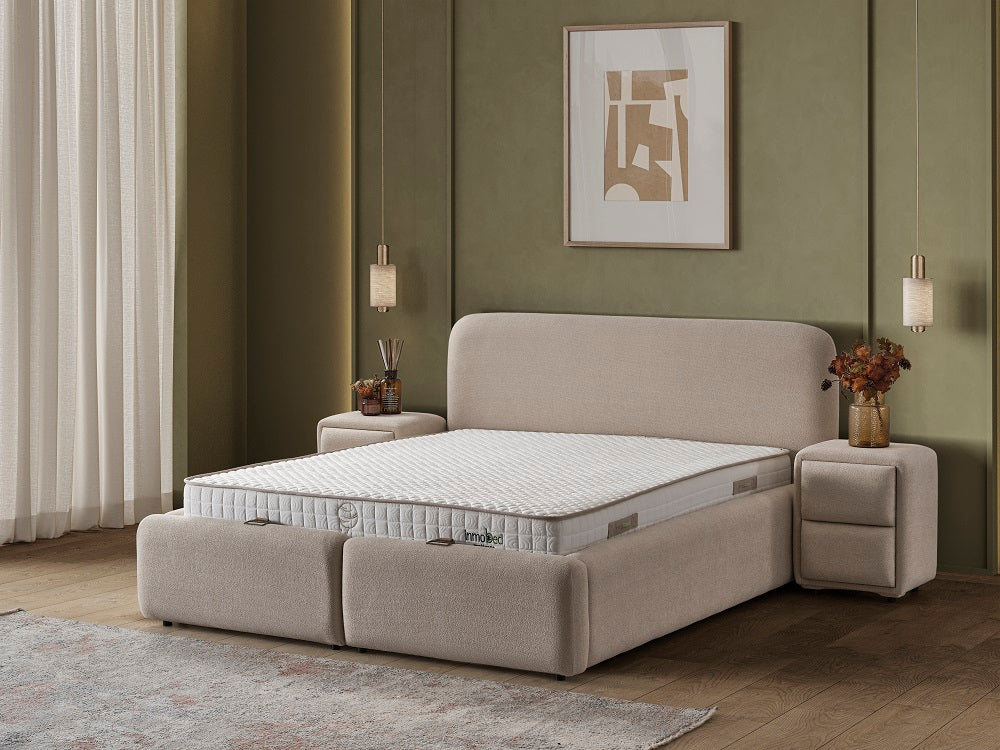 Елегантна тапицирана спалня с изчистен и модерен дизайн, създадена за ценителите на уюта и функционалността. Моделът впечатлява с меки, заоблени форми и фина дамаска в топъл неутрален нюанс, която придава усещане за спокойствие и хармония в интериора.