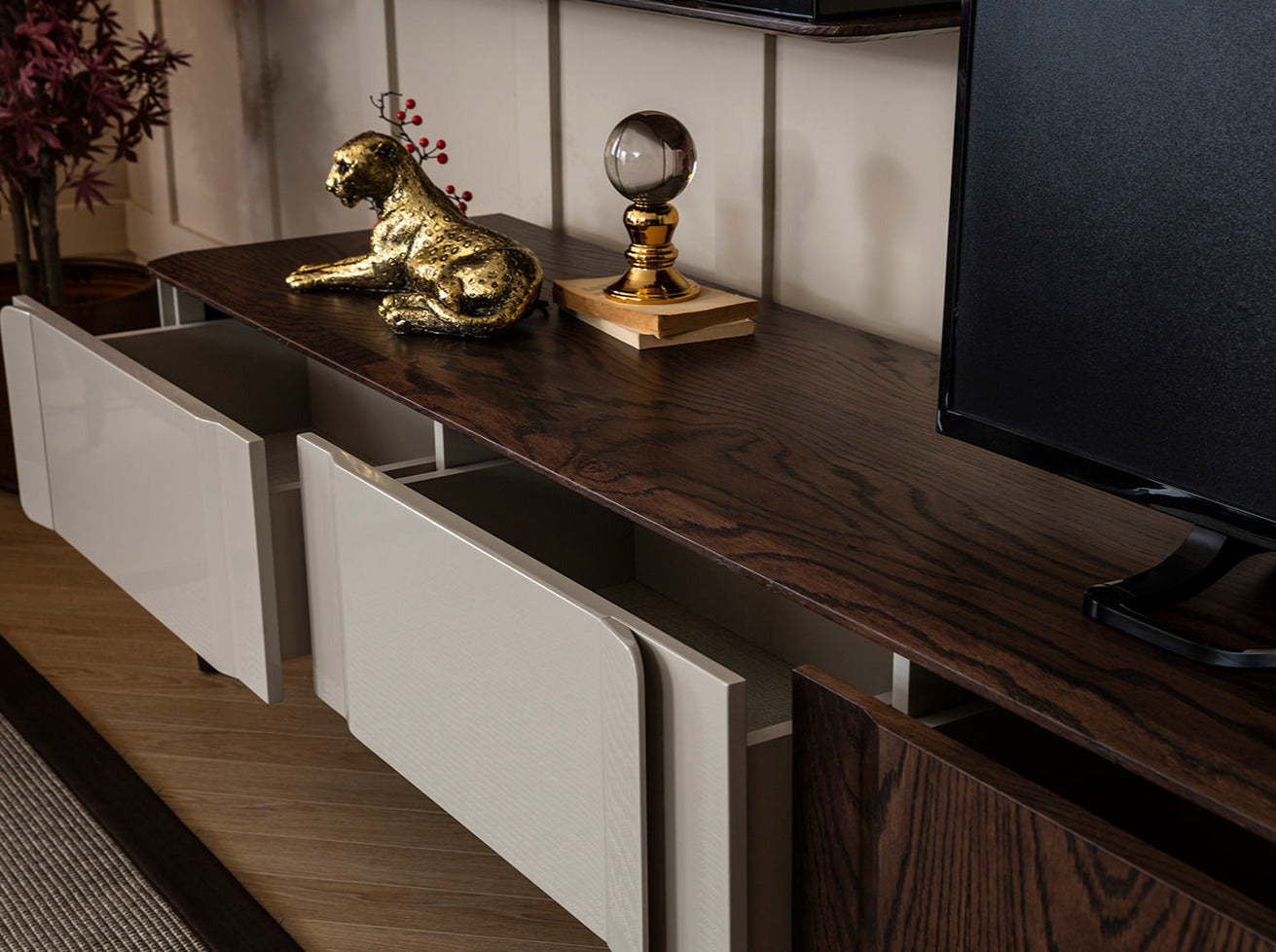 Перфектна изработка от МДФ естествен фурнир, висококачествен мебелен обков с плавно затваряне.